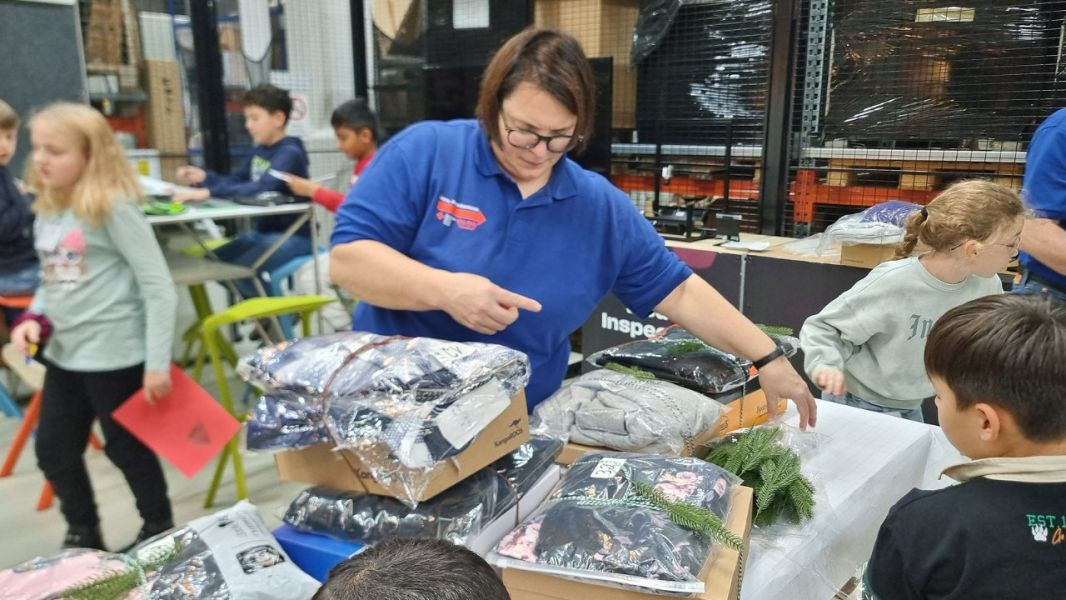 Kurz vor dem Transport wurden die Weihnachtsgeschenke direkt bei Syntax in Weinheim gepackt. Die Schülerinnen und Schüler der 4. Klasse der Schillerschule Mannheim hatten dabei alle Hände voll zu tun: Unter der Leitung von Sandra Czichon packten sie liebevoll jedes einzelne Geschenk für ein Kind in Rumänien. Zu jedem Paket gehörten ein persönlicher Gruß sowie eine kreative, weihnachtliche Dekoration.