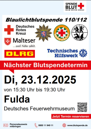 Im Deutschen Feuerwehr findet am Dienstag, 23.12.2025 von 15:30 bis 19:30 Uhr die nächste Blaulichtblutspende 110/112 statt.