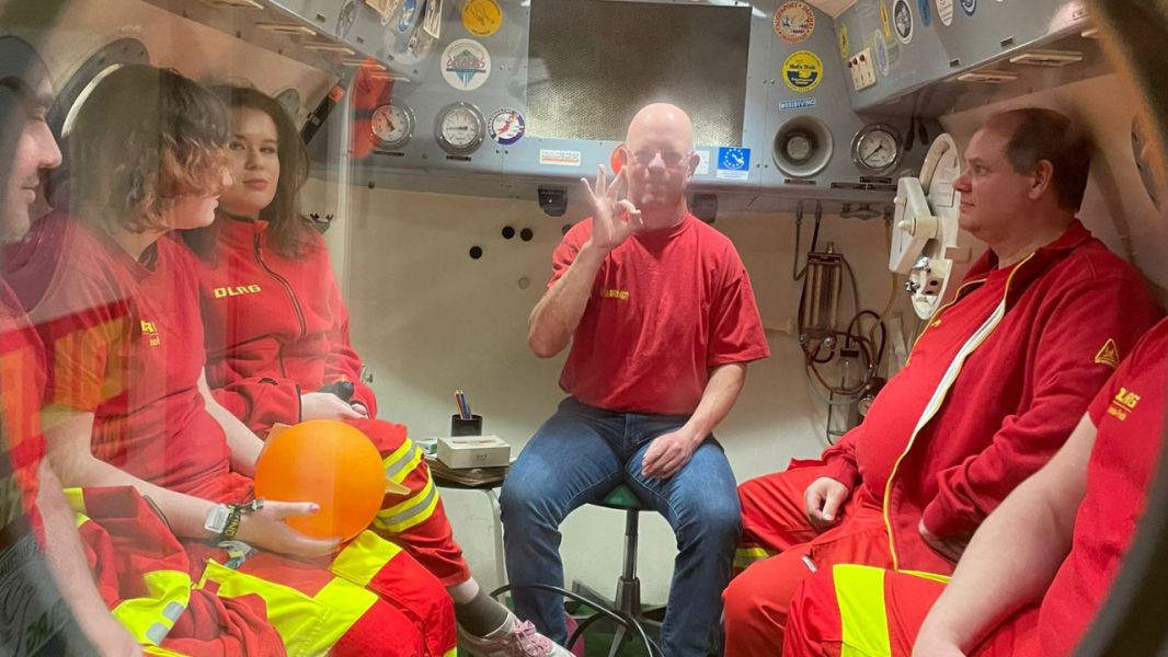 Zusätzlich nahmen wir verschiedene Alltagsgegenstände mit in die Kammer, um die Auswirkungen des steigenden Umgebungsdrucks sichtbar zu machen. Ein spannender und lehrreicher Einblick in die physikalischen Bedingungen, denen Taucherinnen und Taucher im Einsatz ausgesetzt sind.